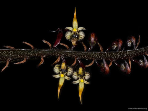Flowering: Experience the beauty of fall as this orchid produces several petite flowers measuring .75 cm each. The plant's inflorescence emerges from a mature pseudobulb, showcasing a mesmerizing display of musky-scented blooms along a 20-inch or longer erect stem.