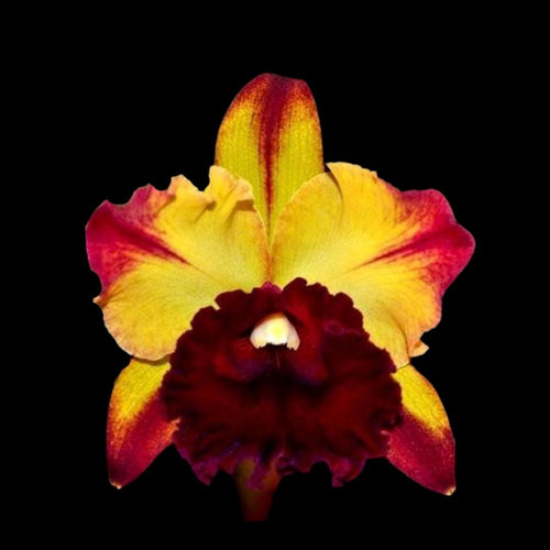 With its large 5 ½ inch yellow flowers adorned with a bold crimson lip, the 'Starburst' variety boasts a stunning display of color contrast that is truly eye-catching. The petals elegantly flare out, showcasing excellent shape and symmetry that adds to its allure. Each bloom exudes a radiant warmth reminiscent of the golden rays of the sun, making it a standout addition to any orchid collection.