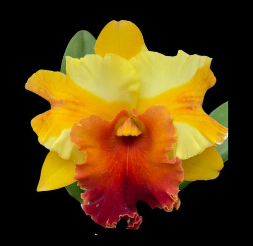Introducing Rlc. Miss Thailand, a captivating hybrid orchid born from the exquisite combination of Haadyai Delight x Amazing Thailand. This remarkable cattleya orchid dazzles with its stunning, multi-colored petals that radiate a warm golden hue with pale yellow centers, accented by vibrant red highlights on the frilly, oversized lip. Its unique coloration is truly rare, making it a prized treasure for any orchid collector.