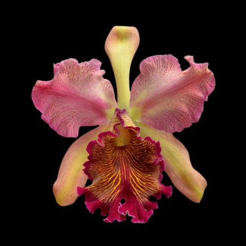 Discover the captivating allure of Cattleya dowiana var. rosita 'Red Baron', a prized orchid species that enchants with its exquisite beauty. The petals and sepals of 'Red Baron' display a delicate, creamy yellow hue gently tinged with pink along the edges, evoking an aura of subtle elegance. What truly sets this variety apart is its flamboyant lip, adorned with red veins that resemble flickering flames, creating a dramatic contrast against its pristine blooms.