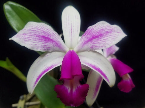Grow in medium light in a well-drained mix. quality cross of this South American species using superior tetraploid parents. White 4" flat flowers with varying degrees of magenta flares and a darker lip with good substance. Will get a few semi albas with no flaring. Usually gets 3 to 6 flowers on a strong inflorescence.