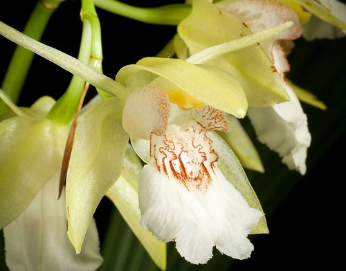 In late spring to early summer, Coelogyne marmorata produces slender, arching inflorescences bearing three to six waxy, fragrant flowers. The blooms open almost simultaneously, but staggered flower spikes ensure an extended period of breathtaking display. Each flower features shades of apple-green to pale white, delicately patterned with fine marbling on the inner lobes—an intricate detail that inspired the species name marmorata (meaning "marbled").