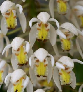 Breathtaking Features: The Coelogyne multiflora lives up to its name with approximately 380 flowers per blooming, emanating a fresh ginger fragrance. Its arching stems bear creamy white flowers with a yellow lip, creating a captivating display in spring. This orchid, particularly the Sulawesi variety, boasts dramatic flower spikes emerging from the center of new growths, reaching heights of up to half a meter.
