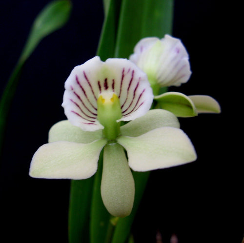 The flowers measure approximately 1.5" and are situated on an upright stem. Their color is a pale green, and the prominent purple striated lip adds an eye-catching touch. The scent of these flowers is reminiscent of root beer. Prosthechea radiata is a highly fragrant species that blooms throughout the fall, winter, and spring.