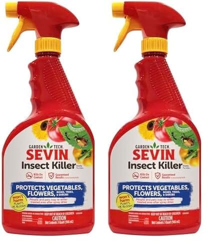 Protect your vegetables and flowers from damaging pests with Sevin Insect Killer Ready-to-Use. This formula will not harm your roses, trees, shrubs, flowers or edibles. Simply shake well and spray. For best results, adjust nozzle to narrow fan spray, and, holding the sprayer about 1 foot from the plant, spray just enough to cover the area that is to be treated. Sevin Insect Killer Ready-to-Use (subscript 2) kills more than 700 insect pests on contact - with visible results in minutes. Use this to kill and control unwanted insects in fruit and vegetable gardens, flowers, roses, trees, and shrubs. Sevin Ready-to-Use is perfect for the protection outdoors around the home from pests like ants, hornworms, stink bugs, japanese beetles, aphids, Colorado potato beetles, whiteflies, cabbage loopers, and many more Do not spray on open blooms to protect pollinating insects. Once applied to area, wait at least 24 hours before watering. This formula is highly effective and fast acting - don't forget to check the label to find the specific application rates for the list of pests.
