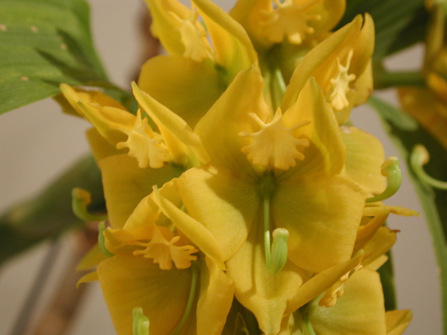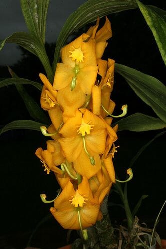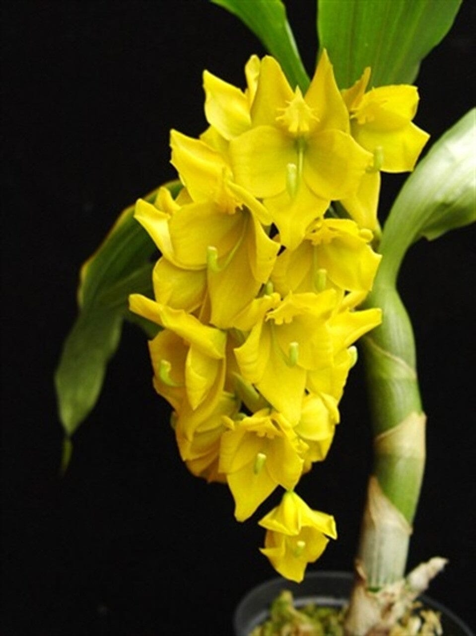 Cycnoches herrenhusanum boasts cascading spikes adorned with multiple flowers in a striking golden yellow hue, accompanied by a delightful fragrance that will enchant your senses. Each pendulous inflorescence carries an impressive 15 to 20 closely spaced, non-resupinate flowers, making it a true showstopper during its winter bloom.